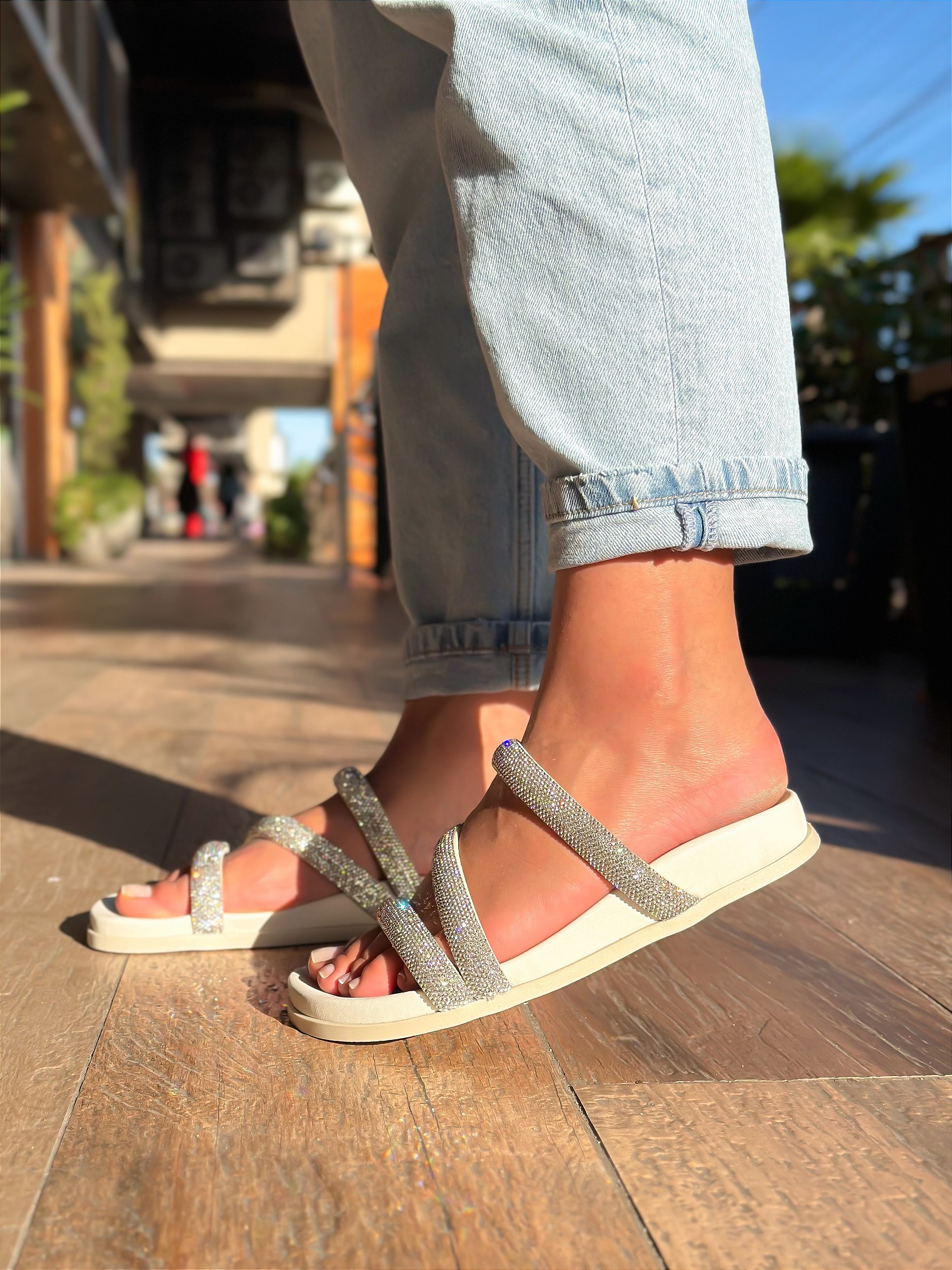 Cheia de personalidade, nossa birken Zaya vem com o cabedal em tiras em meia cana de strass, com o solado anatômico de papete, super prática e da um up naquele look basico. Use-a e abuse nesse verão com vestidos e shorts!