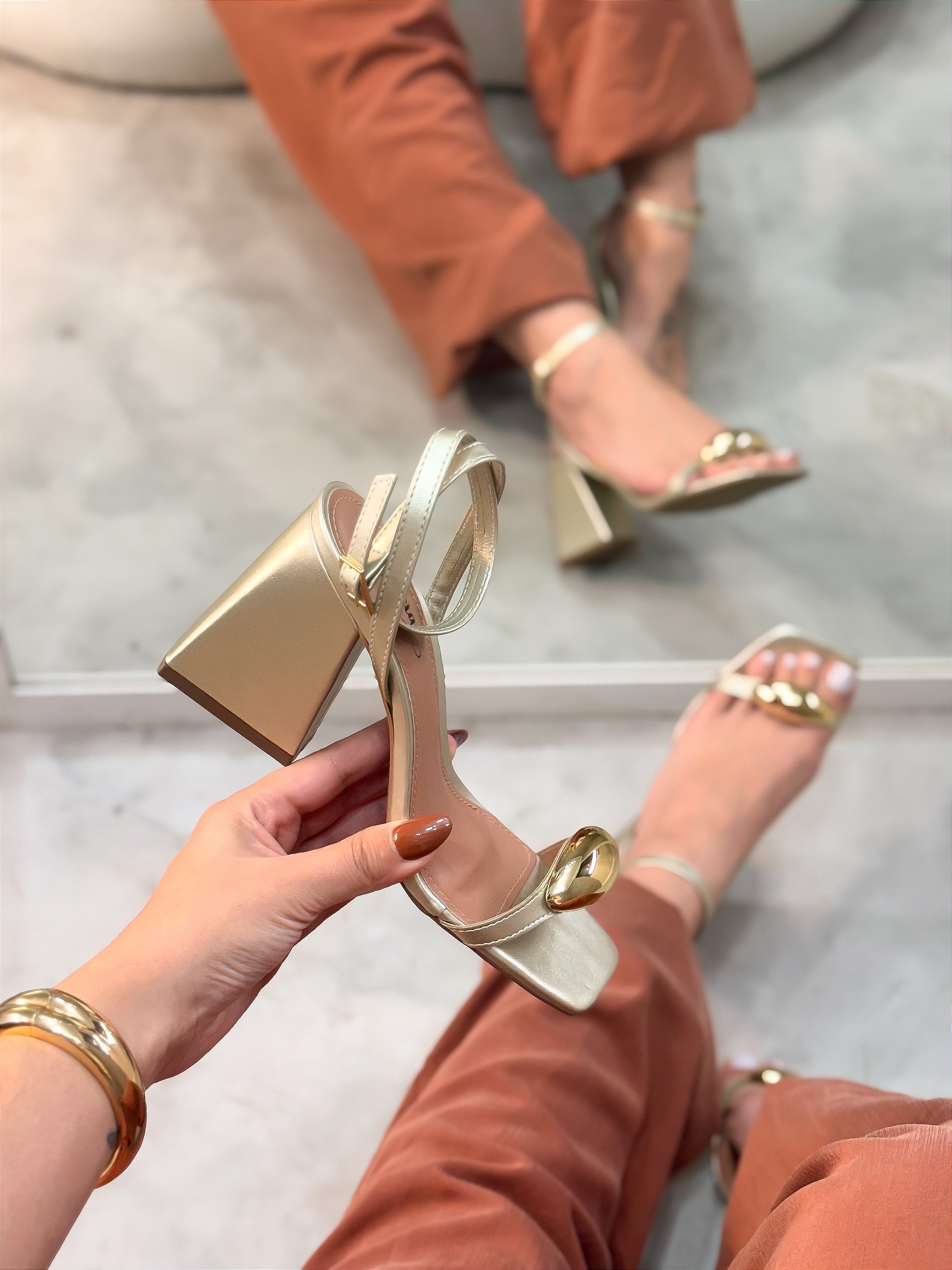 Nossa Sandália possui um toque sofisticado, com a aplicação do metal dourado na tira, trazendo elegância e muita informação de moda. Ela é super confortável e versátil.