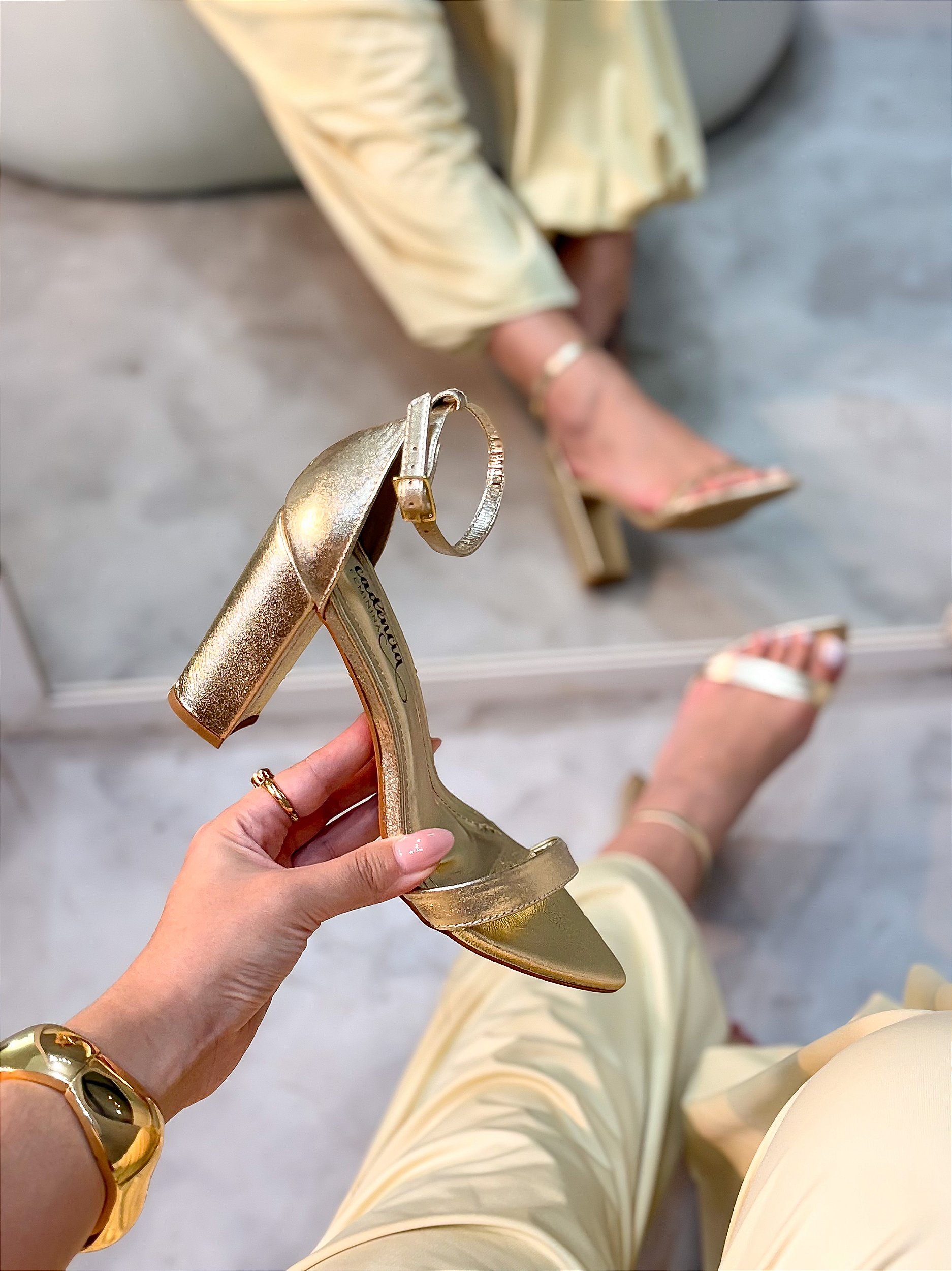Sandália Lola Ouro light em Couro legítimo Salto alto