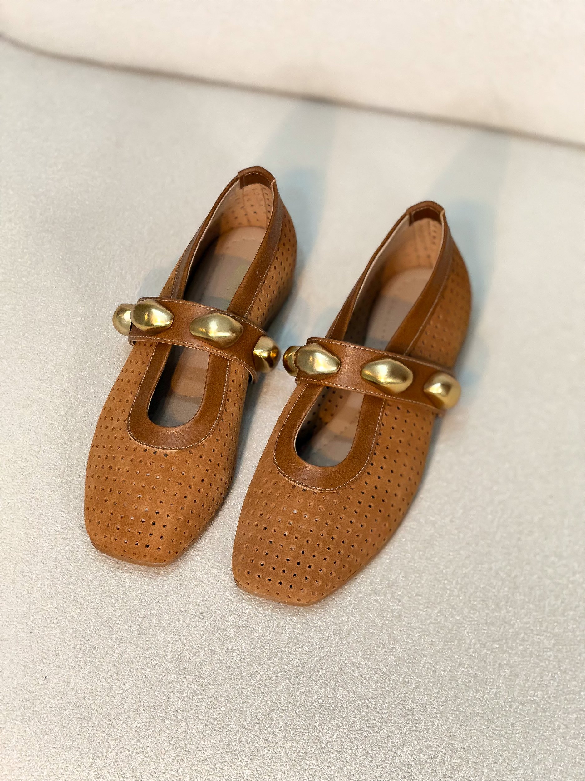 O clássico ganhou atitude! A Cléo é a sapatilha perfeita para quem ama unir elegância e personalidade. Com shape de bico quadrado, material em couro camurça e aplicação de metais dourados bold, ela eleva qualquer look com sofisticação e estilo. Estofada e extremamente confortável, é a escolha certa para quem não abre mão de estar linda o dia inteiro.